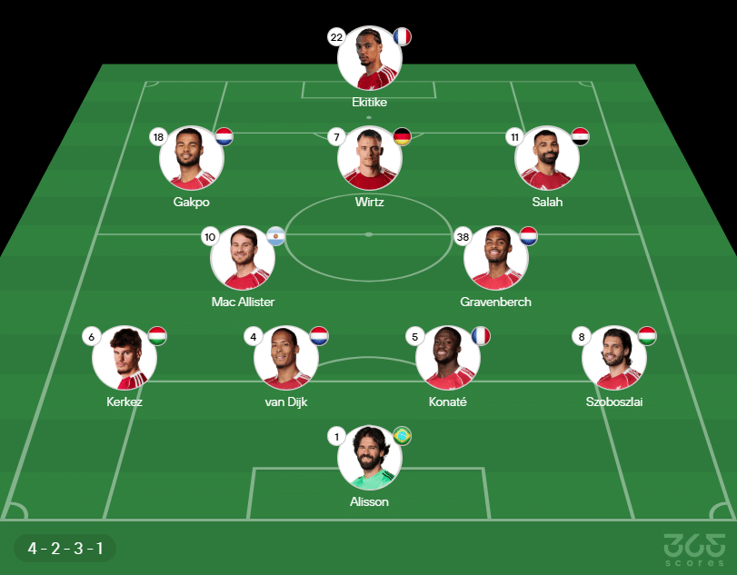 - Escalação do Liverpool: Alisson, Szoboszlai, Konaté, van Dijk e Kerkez; Gravenberch, Mac Allister, Mohamed Salah, Florian Wirtz e Cody Gakpo; Hugo Ekitiké