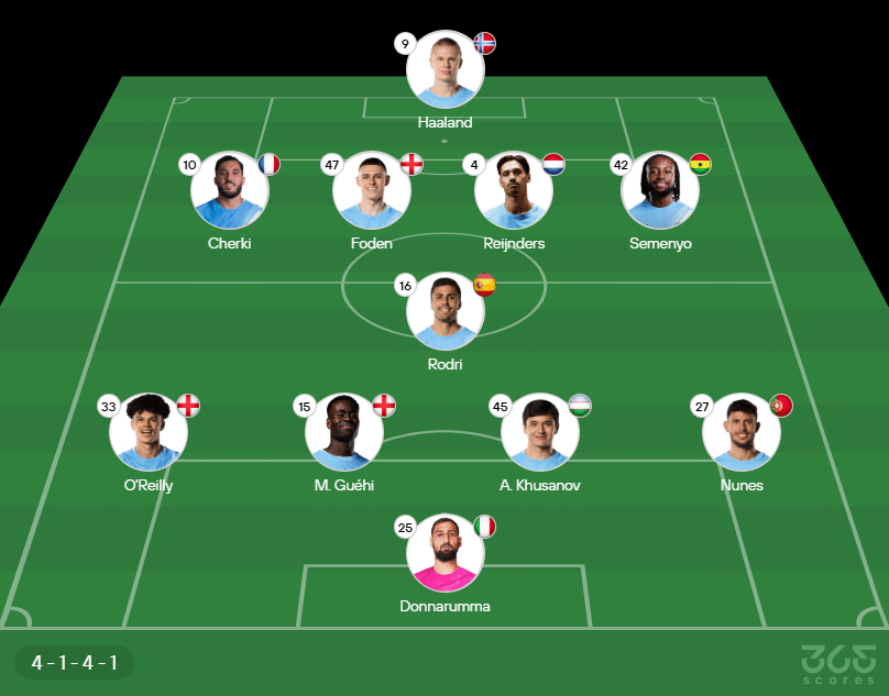 Escalação do Manchester City: Donnarumma, Matheus Nunes, Khusanov, Marc Guéhi e O’Reilly; Rodri, Semenyo, Reijnder, Phil Foden e Rayan Cherki; Erling Haaland. Técnico: Pep Guardiola.