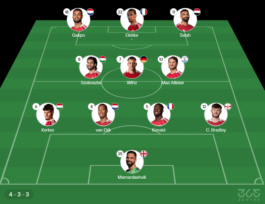 - Escalação do Liverpool: Marmardashvili, Bradley, Konaté, van Dijk e Kerkez; Mac Allister, Florian Wirtz e Szoboszlai; Mohamed Salah, Hugo Ekitiké e Cody Gakpo