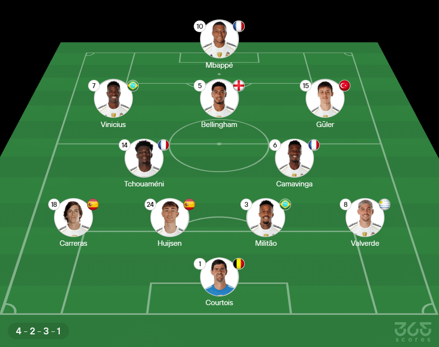 - Escalação do Real Madrid: Courtois, Valverde, Éder Militão, Huijsen e Carreras; Camavinga, Tchouaméni, Arda Güler, Jude Bellingham e Vini Jr; Kylian Mbappé