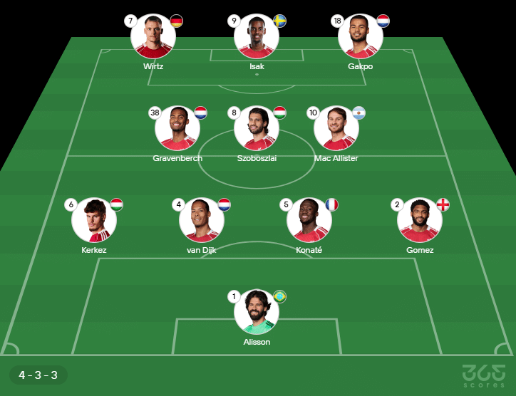 - Provável escalação do Liverpool: Alisson; Gomez, Konaté, Van Dijk, Kerkez; Szoboszlai, Mac Allister, Gravenberch; Gakpo, Wirtz, Isak