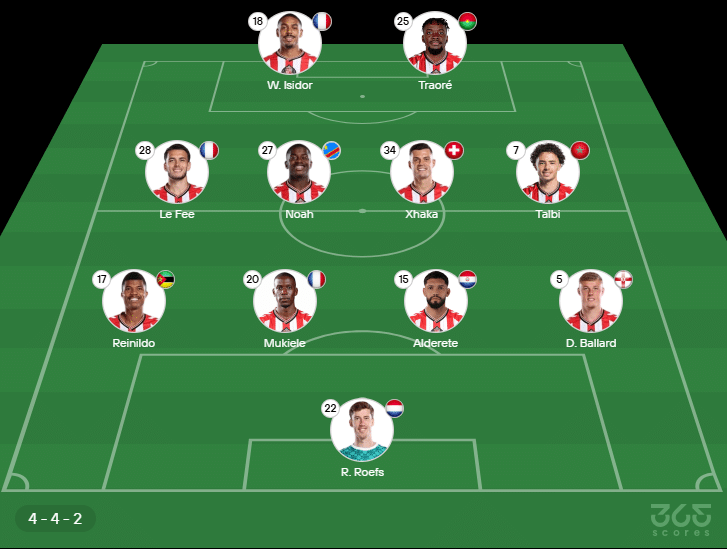 - Provável escalação do Sunderland: Roefs; Ballard, Alderete, Mukiele, Reinildo; Xhaka, Noah, Talbi, Le Fee; Traoré, Isidor