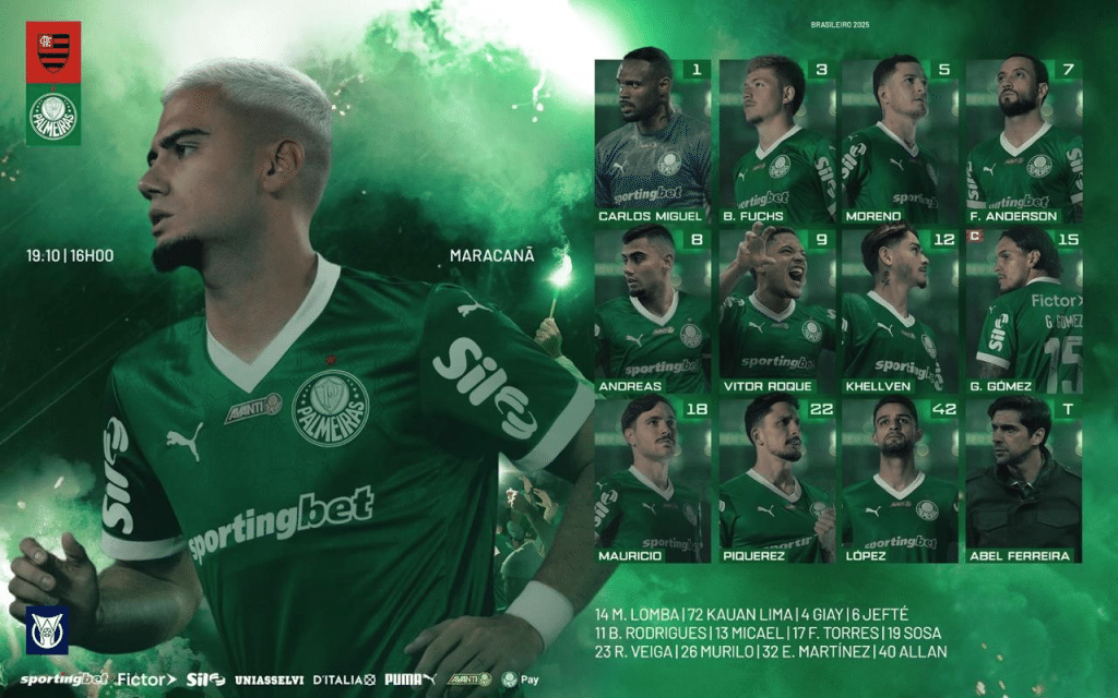 Sem Weverton, o treinador Abel Ferreira teve que fazer uma alteração na meta alviverde para o jogo do Palmeiras contra o Flamengo e escalou Carlos Miguel como titular. As equipes se enfrentam neste domingo (19), às 16h (de Brasília), no Maracanã.