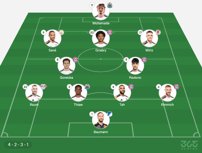 - Escalação da Alemanha: Baumann, Kimmich, Tah, Thiaw, Raum; Pavlovic, Goretzka, Wirtz, Sané, Gnabry; Woltemade
