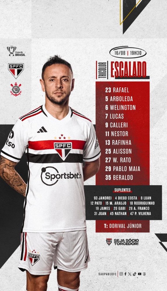 O São Paulo está definido para enfrentar o Corinthians, no Morumbi, às 19h30, nesta quarta-feira, e Dorival Júnior conta com alguns desfalques para a partida. Luciano foi suspenso, e Caio Paulista está lesionado.