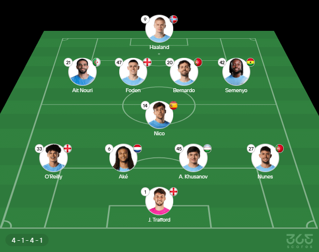 Escalação do Manchester City: Trafford, Matheus Nunes, Khusanov, Aké e O’Reilly; Nico, Semenyo, Bernardo Silva, Phil Foden e Ait Nouri; Erling Haaland. Técnico: Pep Guardiola.