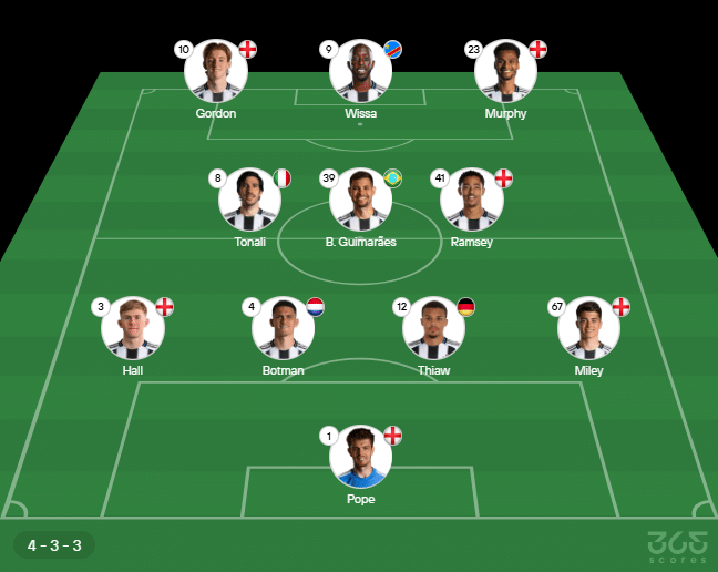 Escalação do Newcastle: Pope, Miley, Thiaw, Botman e Hall; Ramsey, Bruno Guimarães e Tonali; Murphy, Gordon e Wissa. Técnico: Eddie Howe.