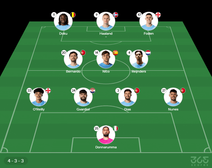 Escalação do Manchester City: Donnarumma, Matheus Nunes, Rúben Dias, Gvardiol e O’Reilly; Reijnders, Nico González e Bernardo Silva; Phil Foden, Jeremy Doku e Haaland. Técnico: Pep Guardiola.