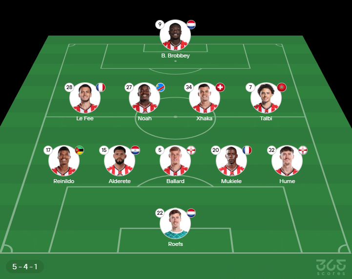 - Escalação do Sunderland: Roefs, Hume, Mukiele, Ballard, Alderet e Reinildo; Talbi, Xhaka, Noah e Le Fee; Brobbey