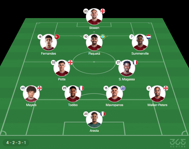 Escalação do West Ham: Areola, Walker-Peters, Mavropanos, Todibo e Mayers; Magassa, Potts, Summerville, Lucas Paquetá e Mateus Fernandes; Bowen. Técnico: Nuno Espírito Santo.