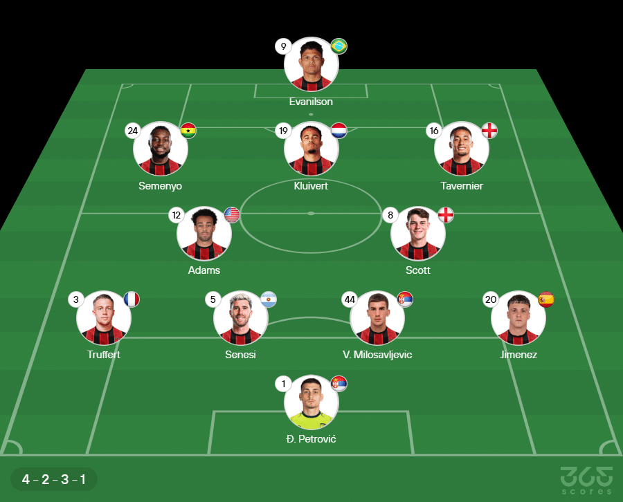 Escalação do Bournemouth: Petrovic, Jimenez, Molosavljevic, Senesi e Truffert; Scott, Adams, Tavernier, Kluivert e Semenyo; Evanílson. Técnico: Andoni Iraola.