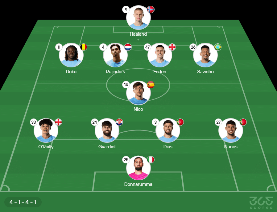 Escalação do Manchester City: Donnarumma, Matheus Nunes, Rúben Dias, Gvardiol e O’Reilly; Nico González, Savinho, Phil Foden, Reijnders e Jeremy Doku; Erling Haaland. Técnico: Pep Guardiola.