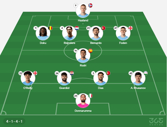 - Provável escalação do Manchester City: Donnarumma, Khusanov, Dias, Gvardiol, O’Reilly; Rodri, Foden, Bernardo Silva, Reijnders, Doku; Haaland