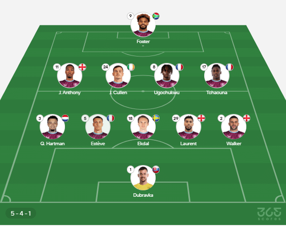 - Provável escalação do Burnley: Dubravka, Walker, Laurent, Ekdal, Estève, Hartman; Tchaouna, Ugochukwu, Cullen, Anthony; Foster