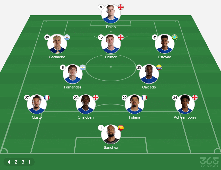 Escalação do Chelsea: Sanchez; Acheampong, Fofana, Chalobah e Gusto; Moisés Caicedo e Enzo Fernández; Cole Palmer, Garnacho e Estêvão; Delap.