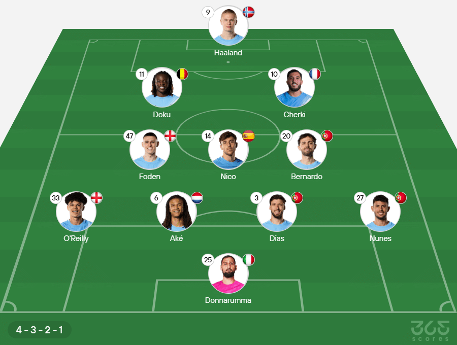 Escalação do Manchester City: Donnarumma; Matheus Nunes, Rúben Dias, Aké e O’Reilly; Nico, Bernardo Silva e Phil Foden; Doku e Cherki; Haaland.