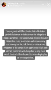 “Eu concordo com o Manchester United em ter um tempo fora enquanto respondo às alegações feitas contra mim. Foi uma decisão tomada em comum acordo para evitar distrair meus companheiros e uma controvérsia desnecessária para o clube. Eu quero reiterar minha inocência no caso em que sou acusado e que irei cooperar integralmente com a polícia para que eles busquem a verdade. Buscarei voltar a jogar o mais rápido possível”, afirmou o atacante.
