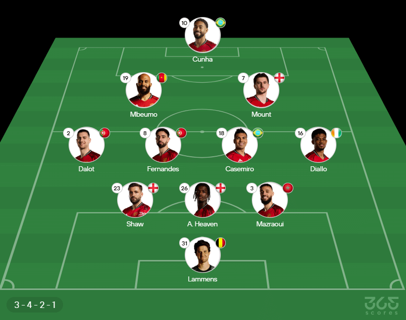 Escalação do Manchester United: Lammens, Mazraoui, Heaven e Luke Shaw; Amad Diallo, Casemiro, Bruno Fernandes e Diogo Dalot; Mason Mount, Mbeumo e Matheus Cunha. Técnico: Rúben Amorim.