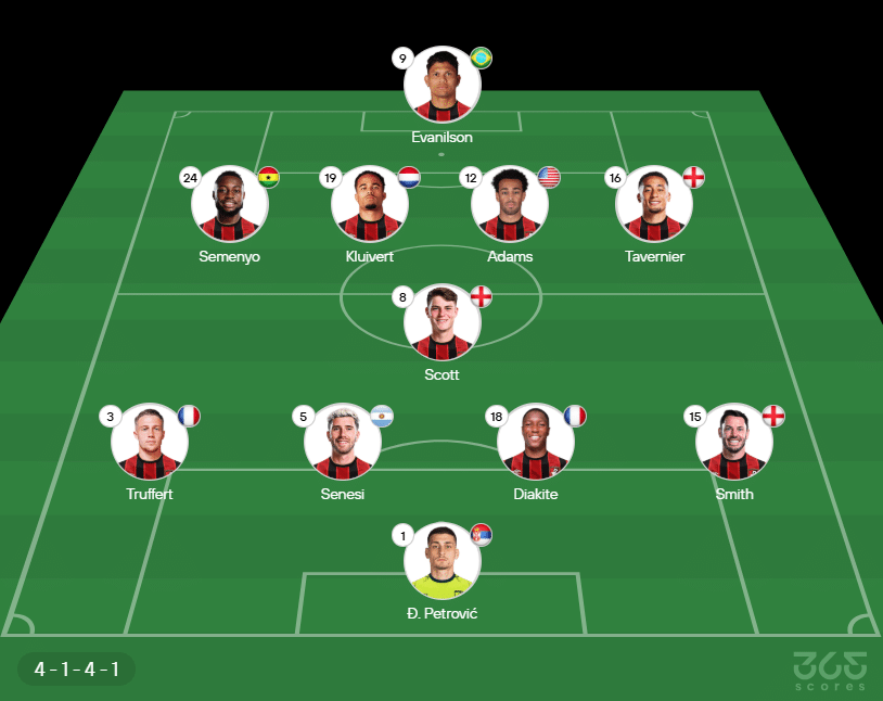 Escalação do Bournemouth: Petrovic, Smith, Diakité, Senesi, Truffert; Scott, Tavernier, Adams, Kluivert e Semenyo e Evanílson. Técnico: Andoni Iraola.