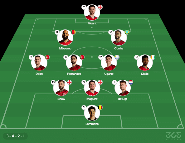 - Provável escalação do Manchester United: Lammens; Luke Shaw, Maguire e de Ligt; Dalot, Bruno Fernandes, Ugarte e Diallo; Mbeumo e Matheus Cunha; Mason Mount