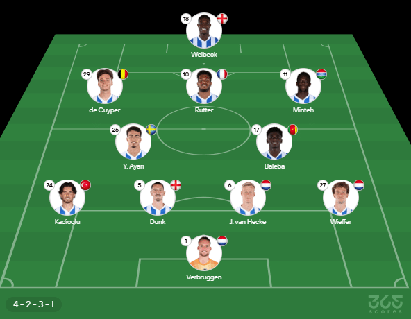 Provável escalação do Brighton: Verbruggen; Kadioglu, Dunk, van Hecke e Wieffer; Ayari e Baleba; de Cuyper, Rutter e Minteh; Welbeck. Técnico: Fabian Hürzeler.