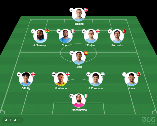 Escalação do Manchester City: Donnarumma, Matheus Nunes, Khusanov, Alleyne e O’Reilly; Rodri, Bernardo Silva, Phil Foden, Rayan Cherki e Semenyo; Haaland. Técnico: Pep Guardiola.