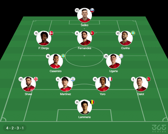 Escalação do Manchester United: Lammens, Diogo Dalot, Leny Yoro, Lisandro Martínez e Luke Shaw; Ugarte, Casemiro, Matheus Cunha, Bruno Fernandes e Patrick Dorgu (Bryan Mbeumo); Benjamin Sesko. Técnico: Michael Carrick.