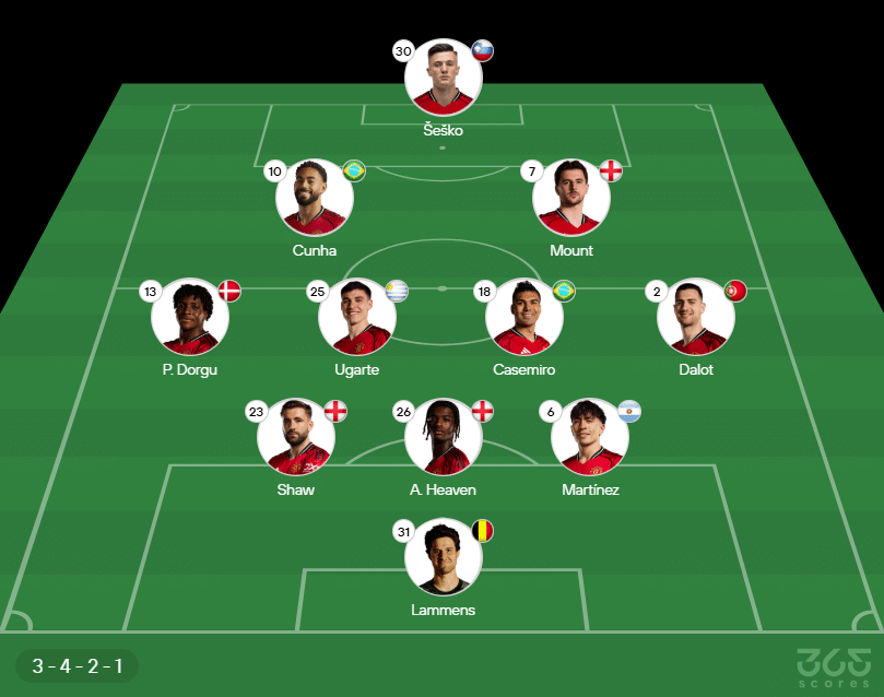 Escalação do Manchester United: Lammens, Lisandro Martínez, Heaven e Luke Shaw; Diogo Dalot, Casemiro, Ugarte e Patrick Dorgu; Mason Mount, Matheus Cunha e Benjamin Sesko. Técnico: Rúben Amorim.