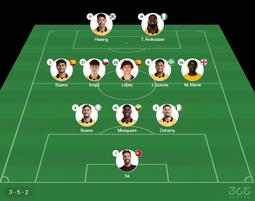 Escalação do Wolves: José Sá; Doherty, Mosquera e Santiago Bueno; Mané, João Gomes, Fer López, Krejci e Hugo Bueno; Arokodare e Hwang. Técnico: Sam Johnstone.