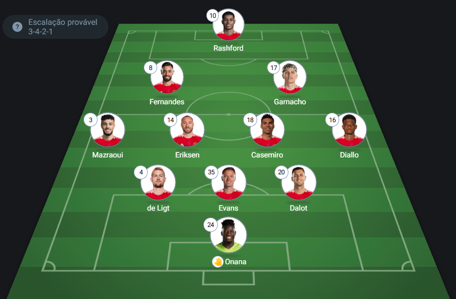 - Provável escalação do Manchester United: Onana, De Ligt, Evans e Dalot; Mazraoui, Eriksen, Casemiro e Amad Diallo; Bruno Fernandes, Alejandro Garnacho e Marcus Rashford