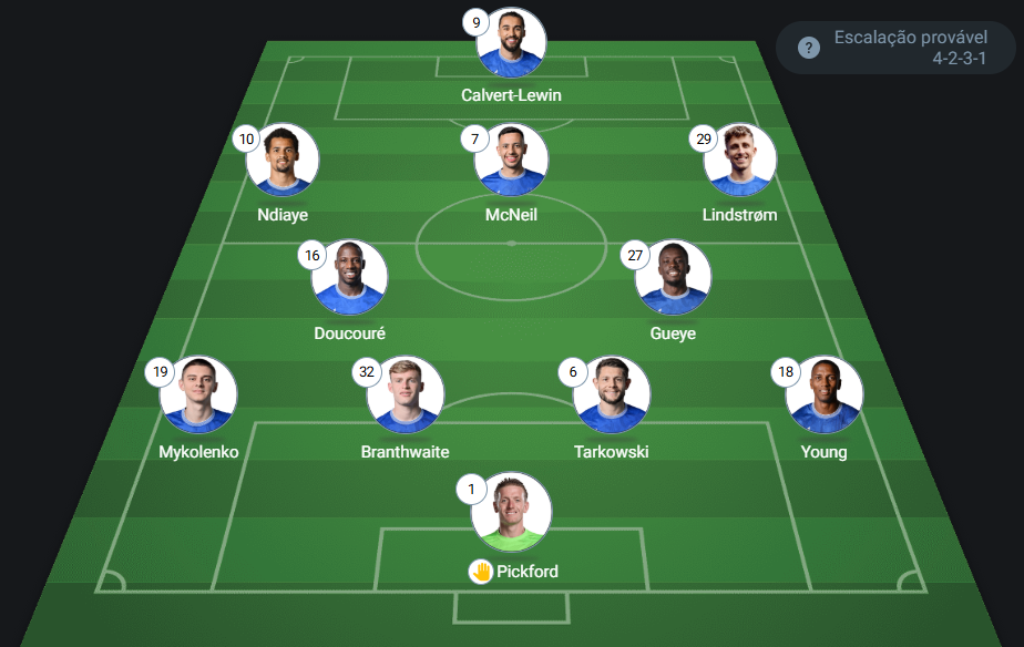 - Provável escalação do Everton: Pickford, Mykolenko, Branthwaite, Tarkowski e Ashley Young; Doucouré, Gueye, Ndiaye, McNeil e Lindstrom; Calvert-Lewin
