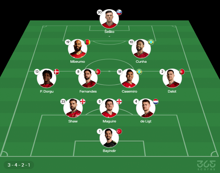 Provável escalação do Manchester United: Bayindir, Luke Shaw, Maguire e De Ligt; Patrick Dorgu, Bruno Fernandes, Casemiro e Diogo Dalot; Mbeumo, Matheus Cunha e Sesko. Técnico: Rúben Amorim.