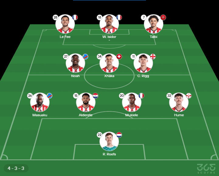 - Provável escalação do Sunderland: Roefs, Masuaku, Alderete, Mukiele e Hume; Noah, Xhaka e Rigg; Le Fee, Isidor e Talbi