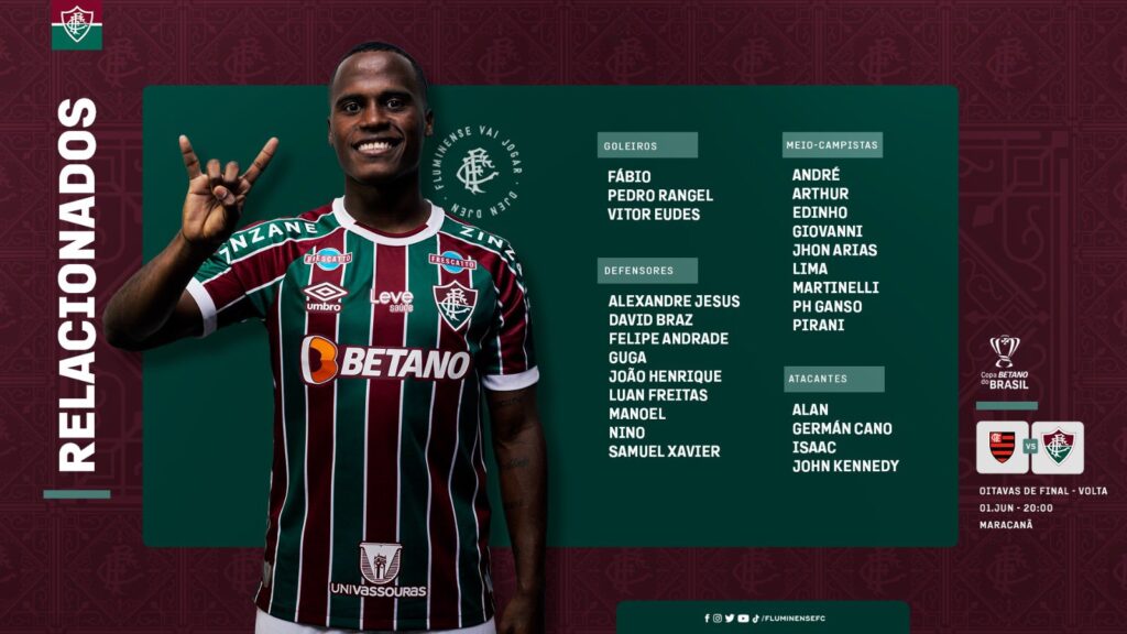 O Fluminense divulgou a relação de jogadores que enfrentarão o Flamengo às 20h desta quinta-feira (1), no Maracanã, pela partida de volta das oitavas de final da Copa do Brasil. O lateral-esquerdo Marcelo está fora.
