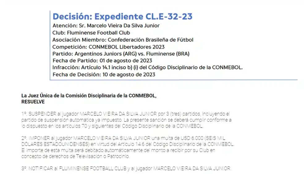 O Fluminense entrou com recurso, porém, sem sucesso. Marcelo ainda recebeu uma multa de 6 mil dólares (R$ 29 mil). Veja o documento emitido pela Conmebol: