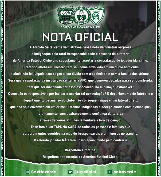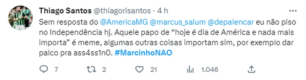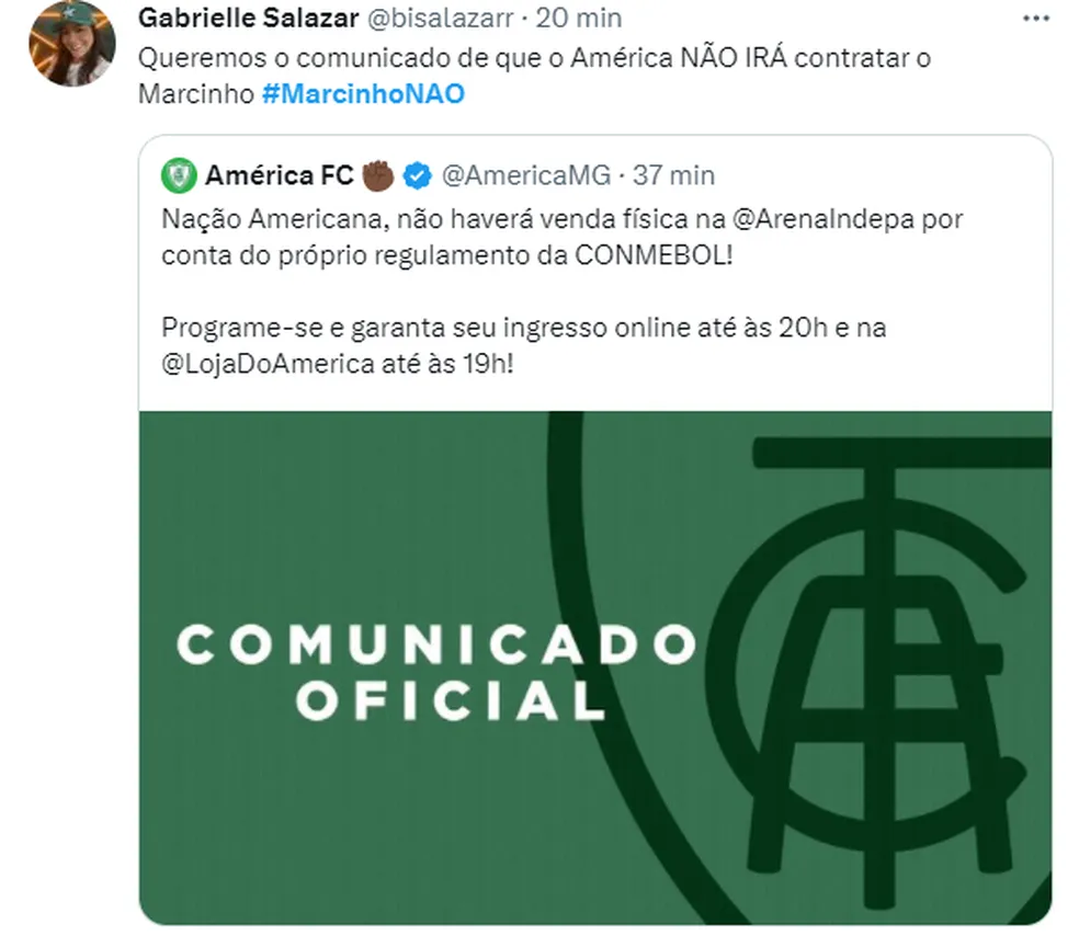 A torcida do América-MG usou as redes sociais para protestar contra a contratação do lateral-direito Marcinho, que fez exames e está perto de assinar vínculo com o time mineiro por empréstimo para suprir a saída de Arthur, negociado ao Bayer Leverkusen na última semana.