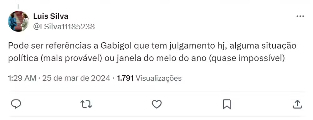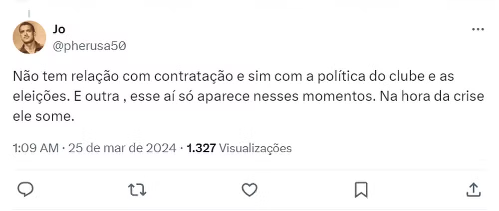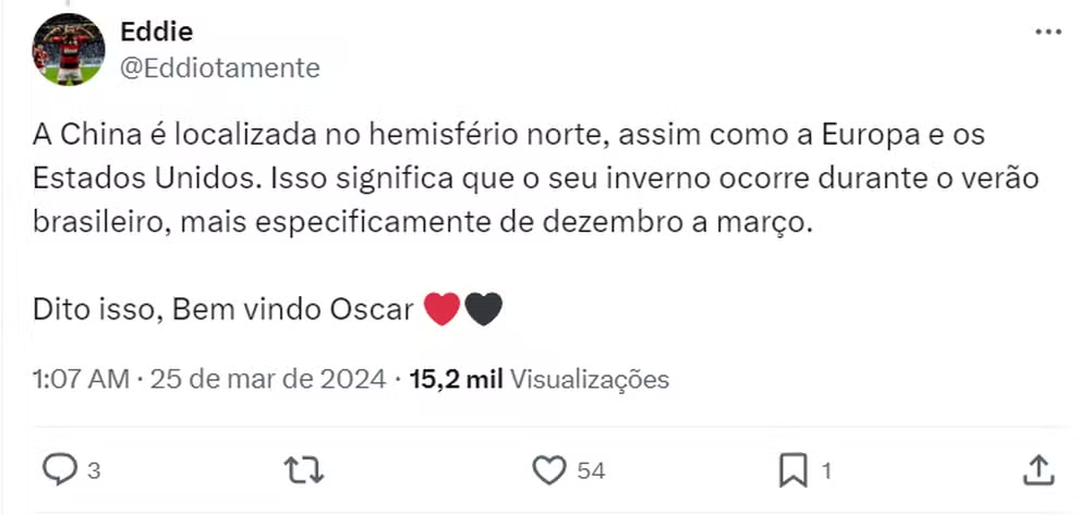 Apesar de não saberem o viés da publicação, os torcedores do Rubro-Negro tentaram adivinhar o que o dirigente quis dizer com o post. Na rede social “X”, alguns acreditam que tenha relação com a contratação de um novo reforço para a equipe de Tite, no entanto, outros acham que é paz ou política.
