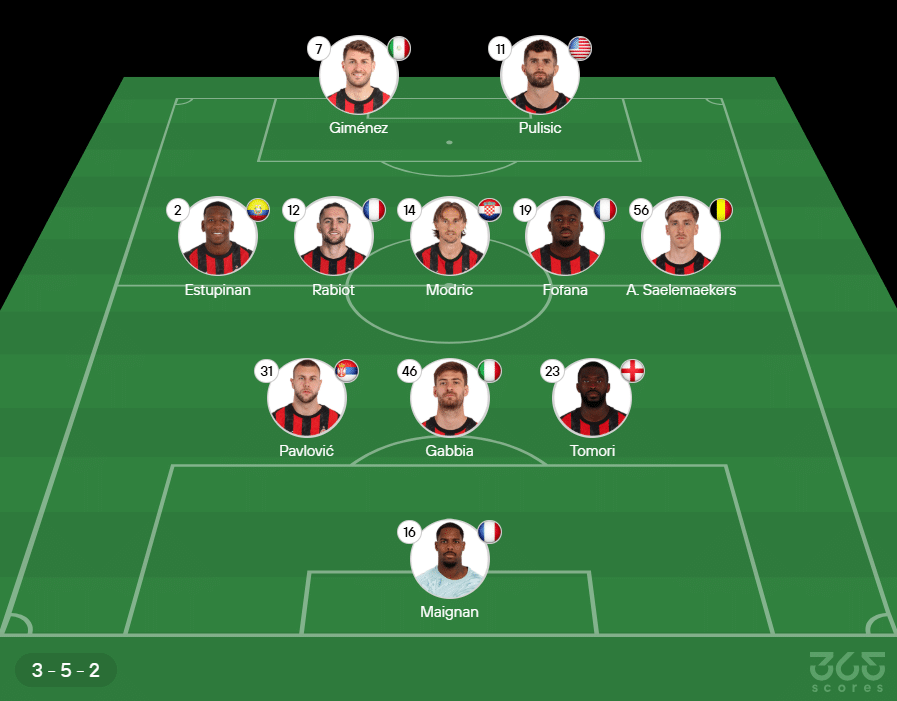 Provável escalação do Milan: Maignan, Pavlovic, Gabbia e Tomori; Estupiñán, Rabiot, Luka Modric, Fofana e Saelemakers; Giménez e Pulisic. Técnico: Massimiliano Allegri.