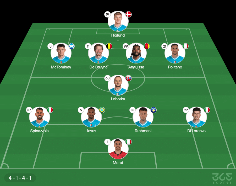 - Provável escalação do Napoli: Meret, Spinazzola, Juan Jesus, Rrahmani e Di Lorenzo. Lobotka, McTominay, Kevin De Bruyne, Zambo Anguissa e Politano; Rasmus Höjlund
