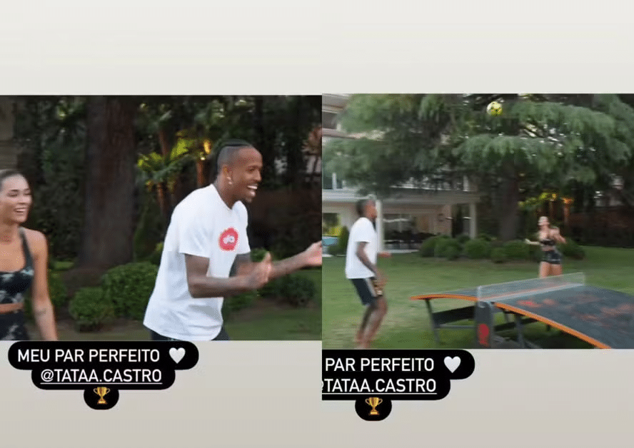 A gravação mostra o casal participando da brincadeira em uma área de lazer contra dois amigos. Na legenda, Militão se declarou para a influenciadora dizendo que ela é seu par perfeito: “Meu par perfeito”.