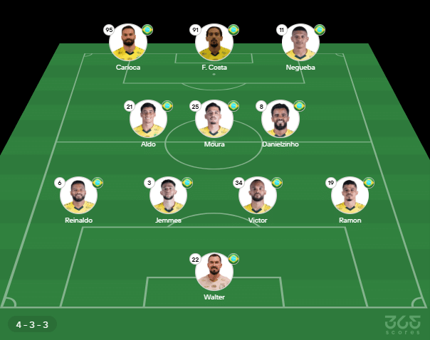 - Provável escalação do Mirassol: Walter; Ramon, Vicor, Jemmes, Reinaldo; Danielzinho, Moura, Aldo; Negueba, Carioca; F. Costa