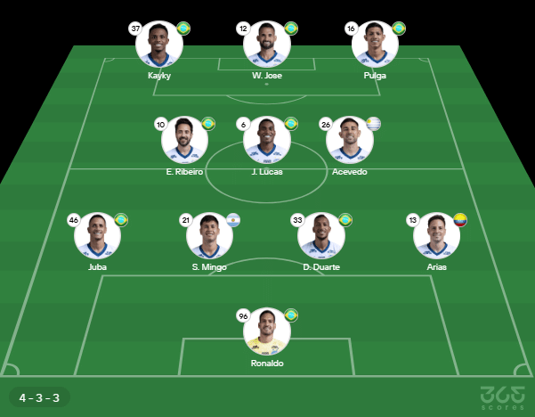 - Provável escalação do Bahia: Ronaldo; Arias, Duarte, Mingo, Juba; Acevedo, Jean Lucas, Everton Ribeiro; Pulga, Kayky, W. Jose