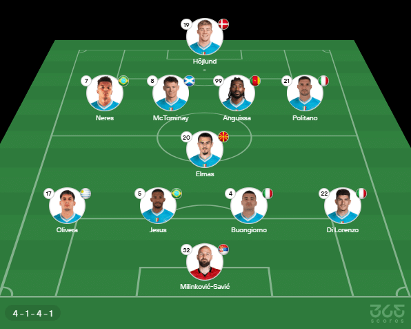 - Provável escalação do Napoli: Milinkovic-Savic; Di Lorenzo, Buongiorno, Jesus, Olivera; Elmas, Politano, Anguissa, Mc Tominay, Neres; Hojlund