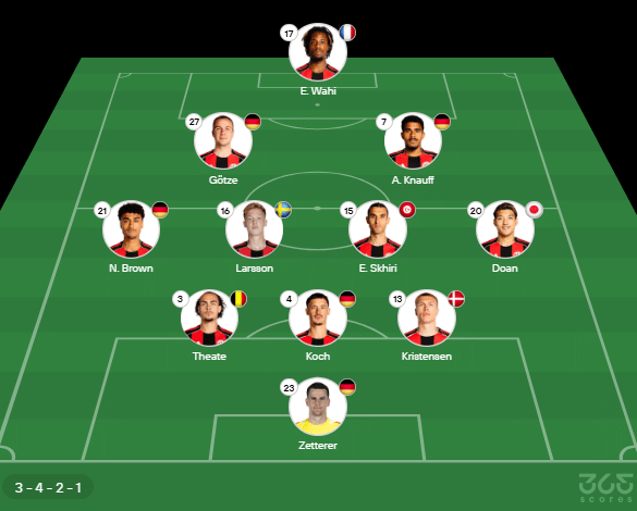 - Provável escalação do Frankfurt: Zetterer; Kristensen, Koch, Theate; Doan, Skhiri, Larsson, N. Brown, Knauff, Gotze, Wahi