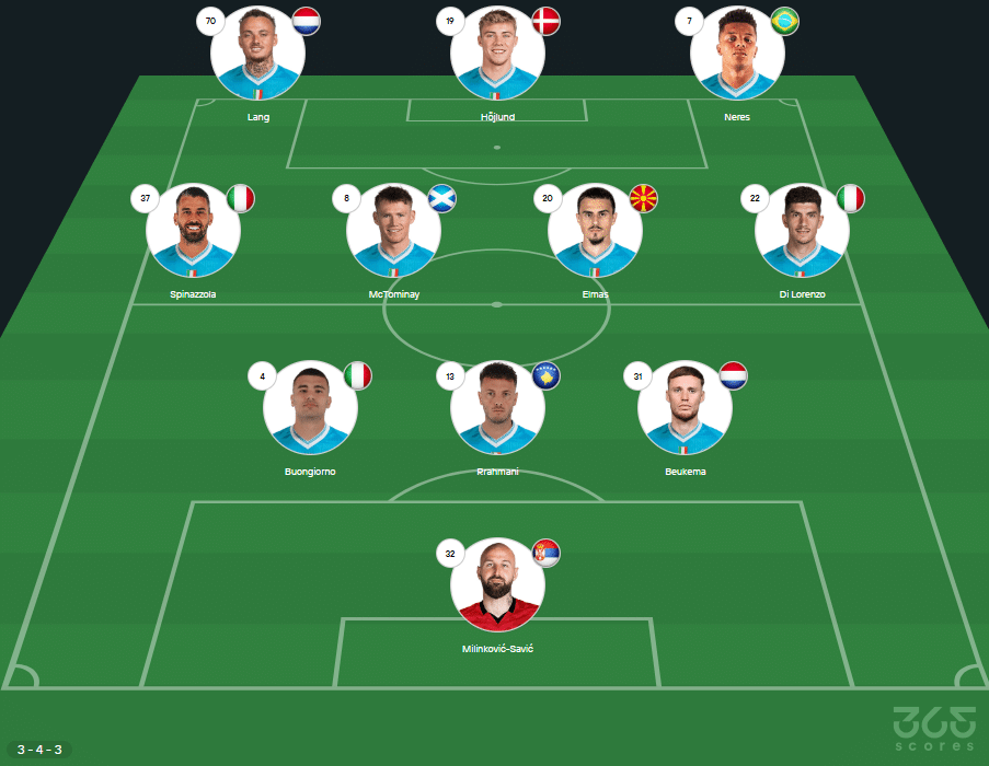 Provável escalação do Napoli: Milinkovic-Savic; Beukema, Rrahmani e Buongiorno; Di Lorenzo, Eimas, McTominay e Spinazzola; David Neres, Hojlund e Lang. Técnico: Antonio Conte.