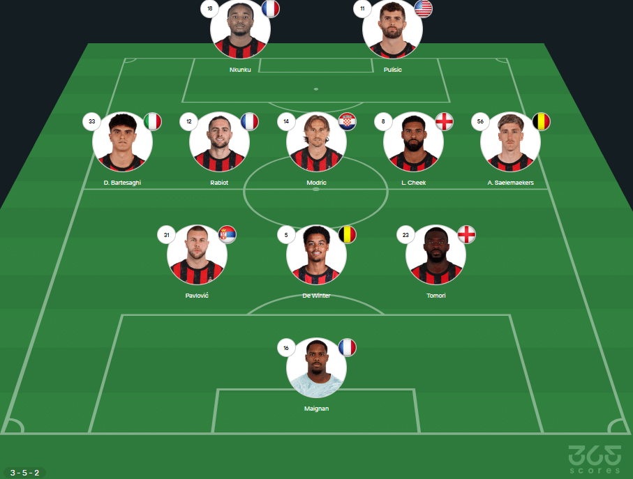 - Provável escalação do Milan: Maignan; Tomori, De Winter e Pavlovic; Saelemaekers, Loftus-Cheek, Modric, Rabiot e Bartesaghi; Pulisic e Nkunku