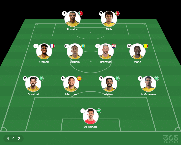 Escalação do Al-Nassr: Al-Aqueedi, Al Ghanam, Al-Amri, Iñigo Martínez e Boushal; Sadio Mané, Brozovic, Ângelo e Kinglsey Coman; João Félix e Cristiano Ronaldo. Técnico: Jorge Jesus.