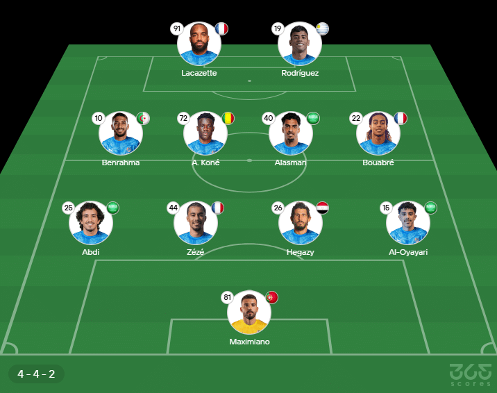 - Escalação do NEOM: Maximiano, Al-Oyayari, Hegazy, Zézé e Abdi; Bouabré, Alasmari, Koné e Benrahma; Alexandre Lacazette Luciano Rodríguez