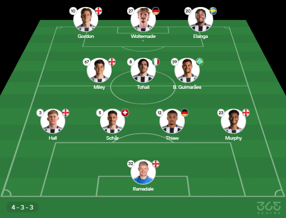 - Provável escalação do Newcastle: Ramsdale; Murphy, Thiaw, Schar e Hall; Bruno Guimarães, Tonali e Miley; Elanga, Woltemade e Gordon
