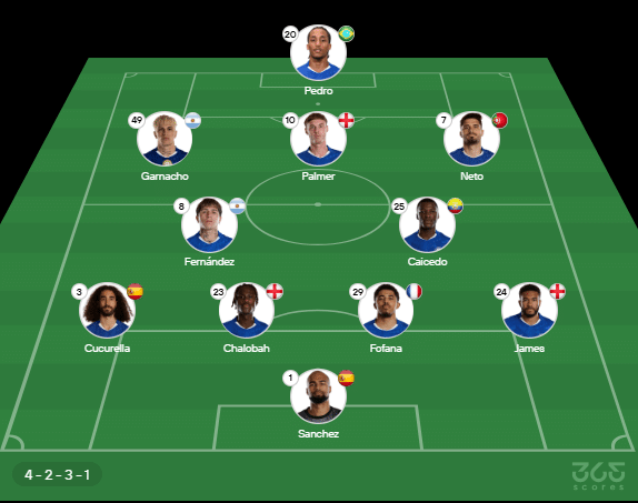 Provável escalação do Chelsea: Sanchez; James, Fofana, Chalobah e Cucurella; Caicedo e Enzo Fernández; Pedro Neto, Cole Palmer e Garnacho; João Pedro. Técnico: Enzo Maresca.